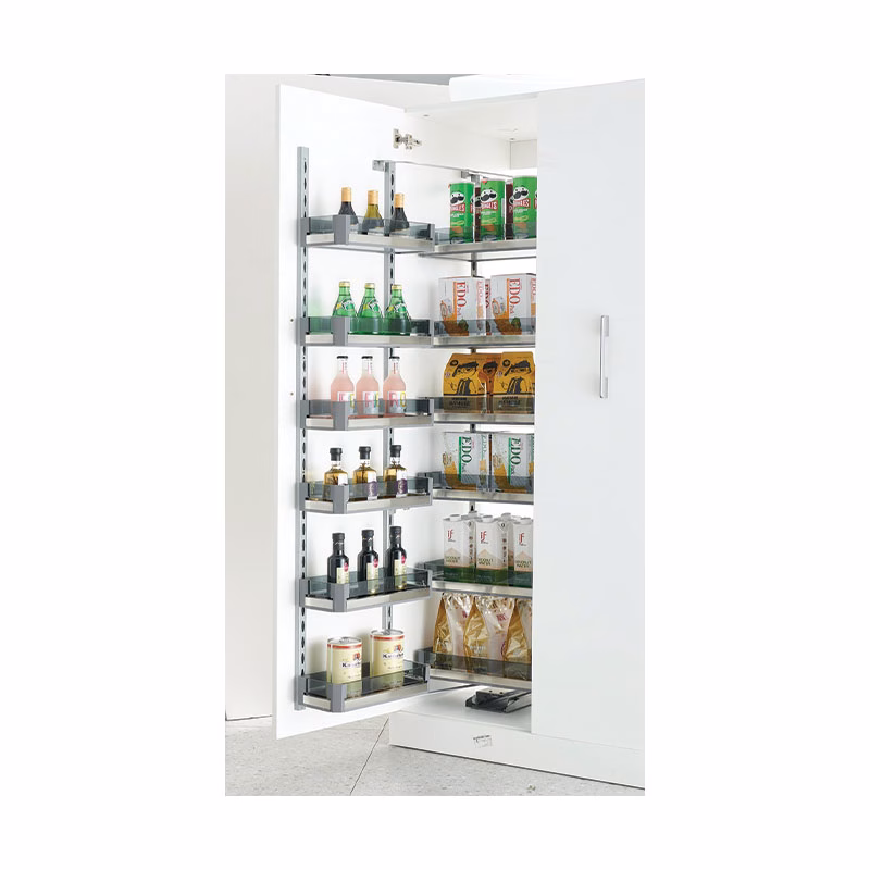 Don’t have space for a walk-in pantry? Newmatic has you covered with the BK7345 Pull-Out Pantry, which is constructed of durable chrome steel and boasts six detachable shelves to store your groceries. Optimize your kitchen with Newmatic kitchen hardware today.Â